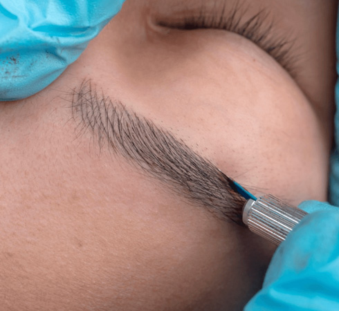 Microblading is a technique in which pigment is deposited into the skin using a fine blade that mimics the appearance of natural hair strokes. This method is ideal for clients with sparse, thin, or over-plucked eyebrows, as it creates a fuller, natural look that is customized to your face shape and preferences.